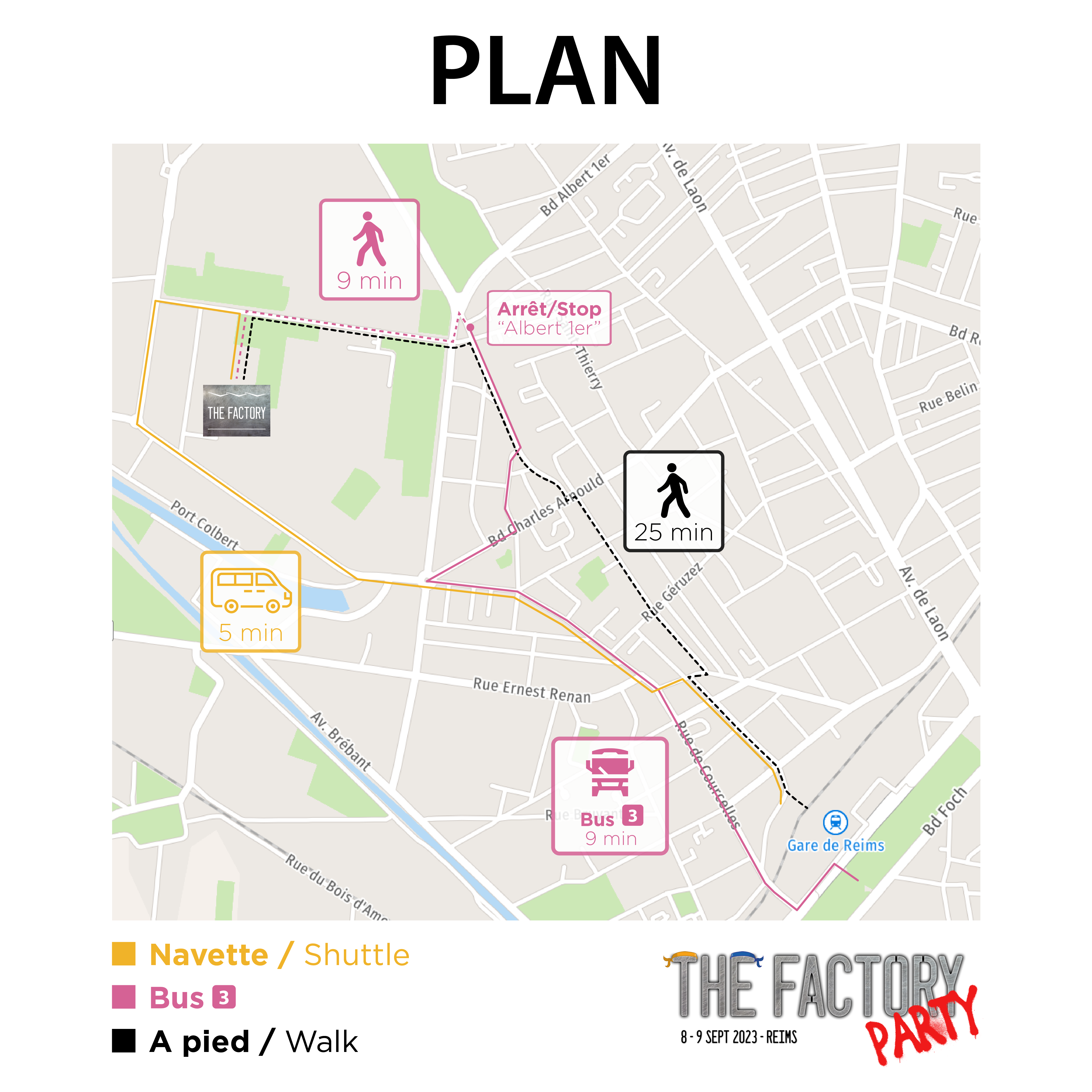 Profitez des navettes Factory qui relient la gare de Reims Centre et The Factory ! Les horaires, arrêts et conditions d’accès seront disponibles en ligne en amont de l’événement. Prix d’un trajet : 2€